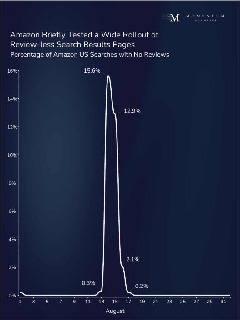 Between August 14 and 15, 2024, Amazon dramatically scaled the display of search pages with no reviews shown. On the August 14 peak, a full 15.6% of the top one million Amazon US search terms displayed no review counts, but this level quickly came back down in the ensuing days. This follows similar short-lived rollouts in both August and September of 2023, although each of those tests lasted more than a week.