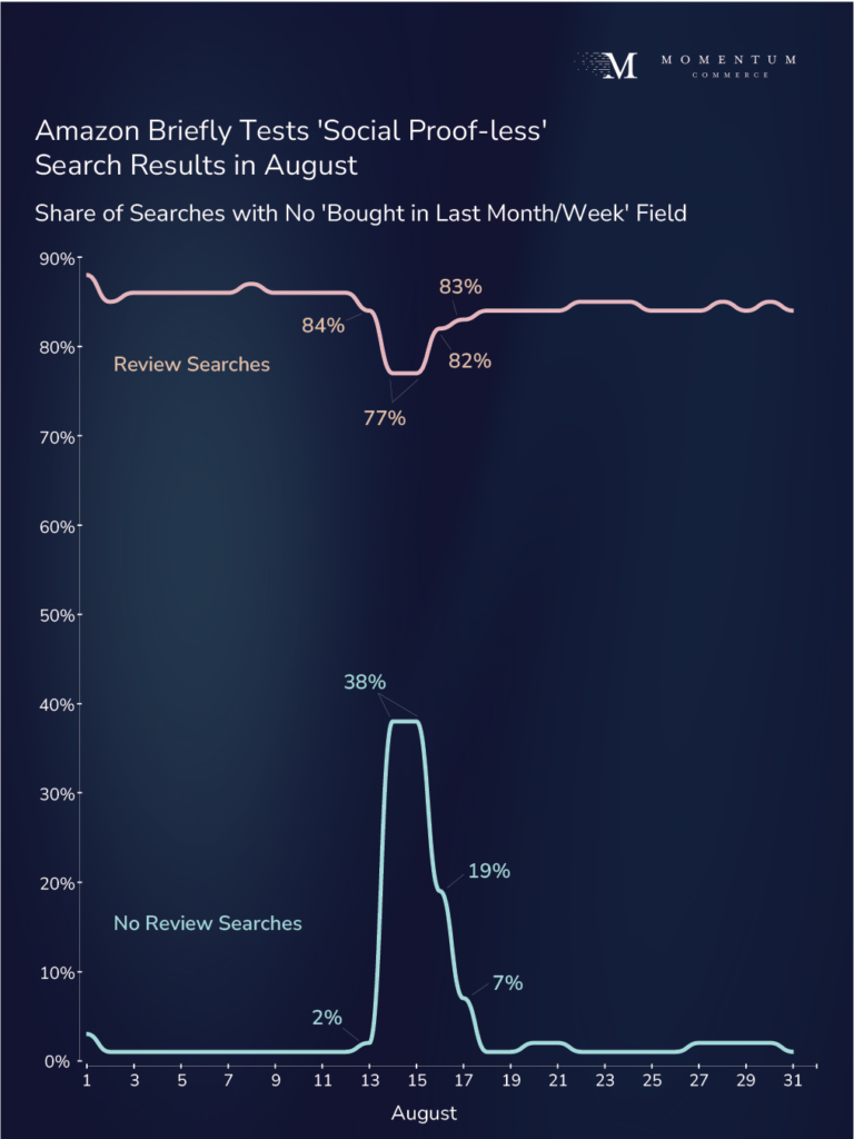 Amazon seems to not only be narrowing the scope of the test from a category point of view, but also expanding it in other ways. The ‘X bought in last week/month’ labels that often accompany a search result – which were present across more than 97% of ‘no review’ searches prior to the test – were gone from 38% of those searches during the test period. This largely eliminated any form of ‘social proof’ on the impacted SERPs.