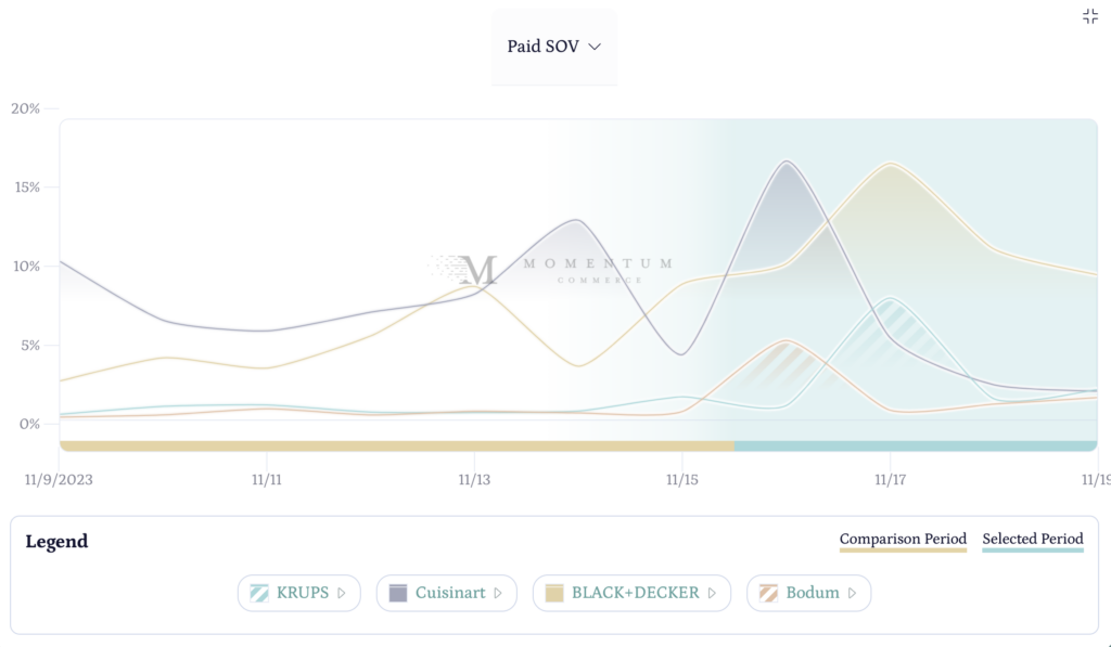 - Brands within the Coffee Maker subcategory are in an intense battle for Paid SOV. In the selected period, Black and Decker gained 6.59% in Paid SOV, while other brands like KRUPS (-27.25%) and Cuisinart (-21.43%) opted for heavier discounting.