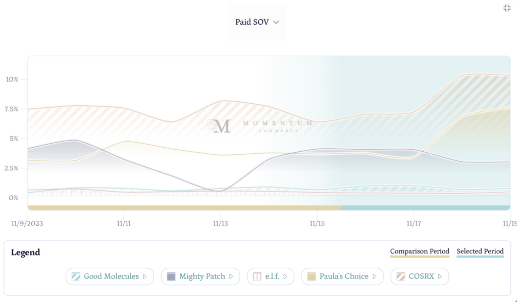 - COSRX stands out as a top brand in the category rounding out the weekend with a 10.4% Paid SOV, but only offering a 3.63% price reduction.
