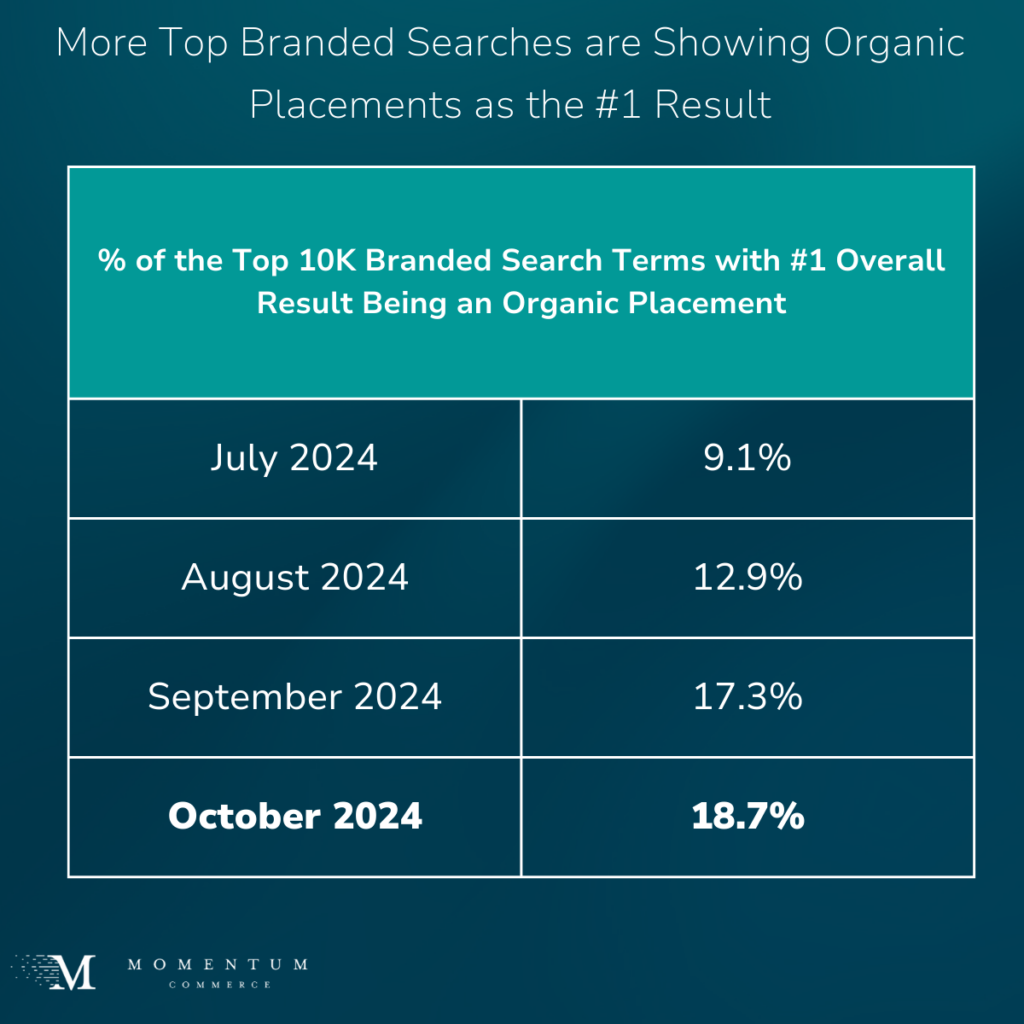 While we observed this same phenomenon across top branded search terms in the beauty category, in October 2024, organic results were the first result across 18.7% of top branded search terms on Amazon US as a whole compared to just 17.3% the month prior.