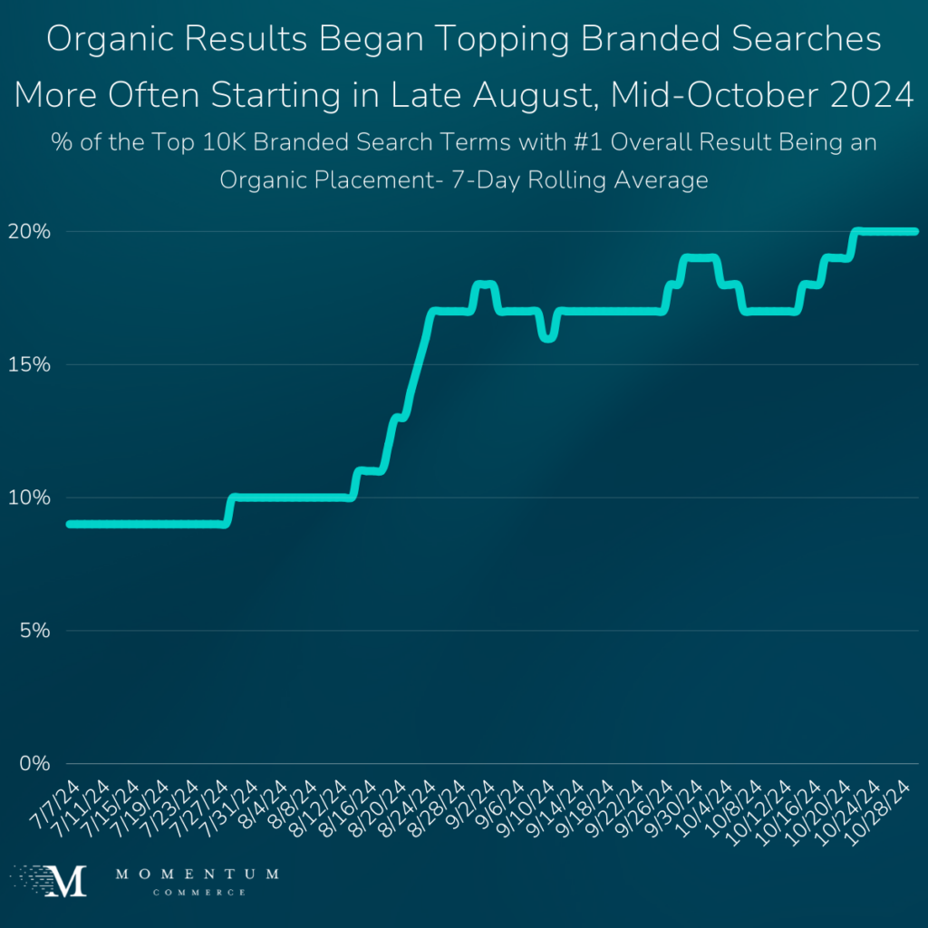 On a time-series basis, there was a steady increase in the share of branded terms exhibiting this ‘organic-first’ SERP beginning in the weeks following Prime Big Deal Days.