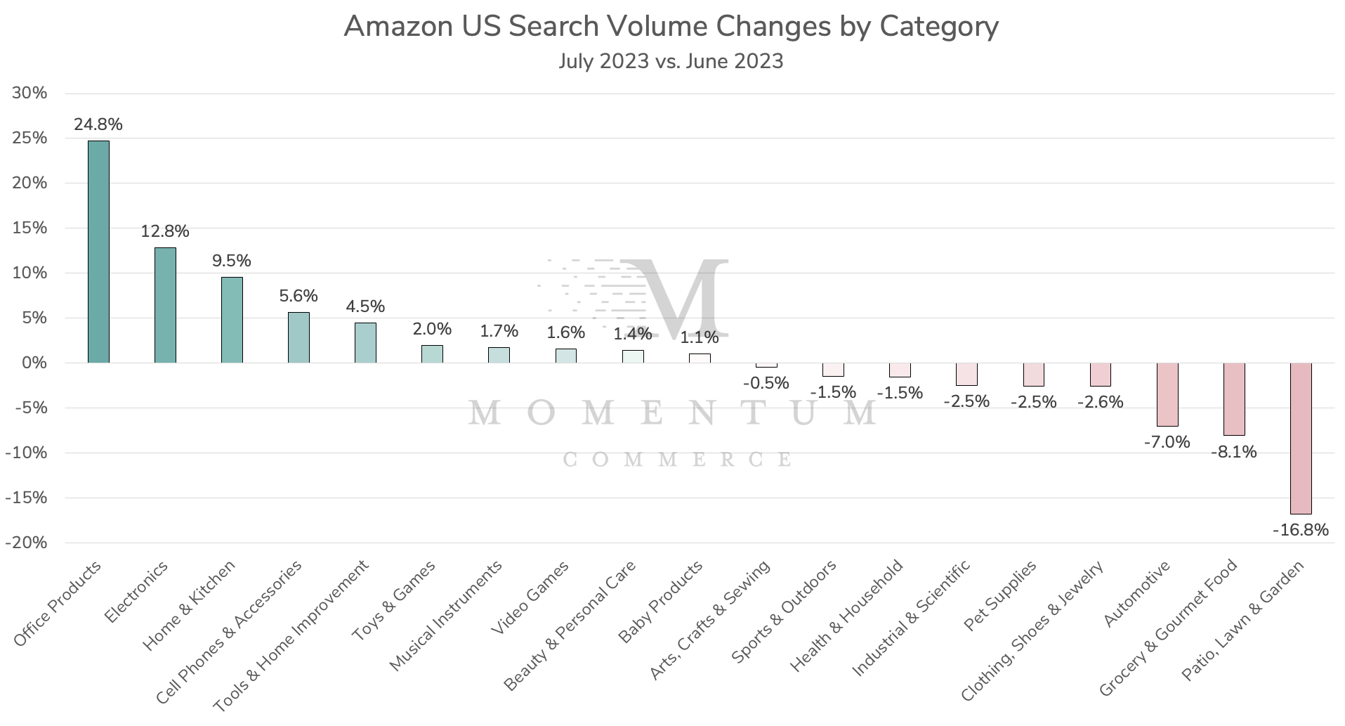 - Month-over-month (MoM) data shows search volume increases for ‘bigger-ticket’ categories generally associated with Prime Day – Office Products (+24.8%), Electronics (+12.8%), and Home & Kitchen (+9.5%)