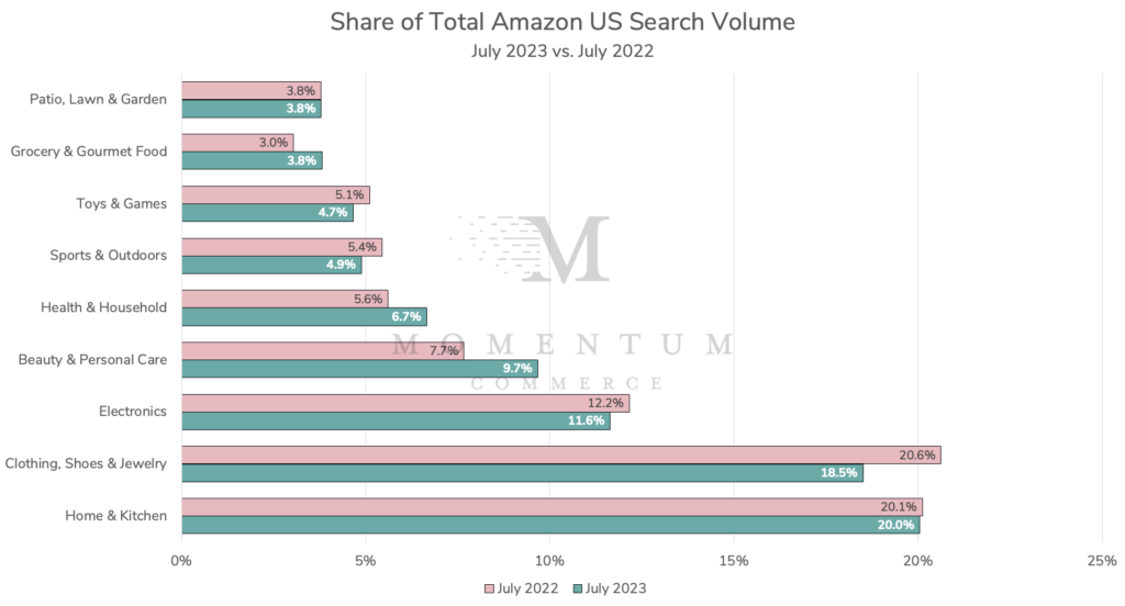 - These categories now account for a collective 23% of Amazon search volume – up from just 18.3% one year ago