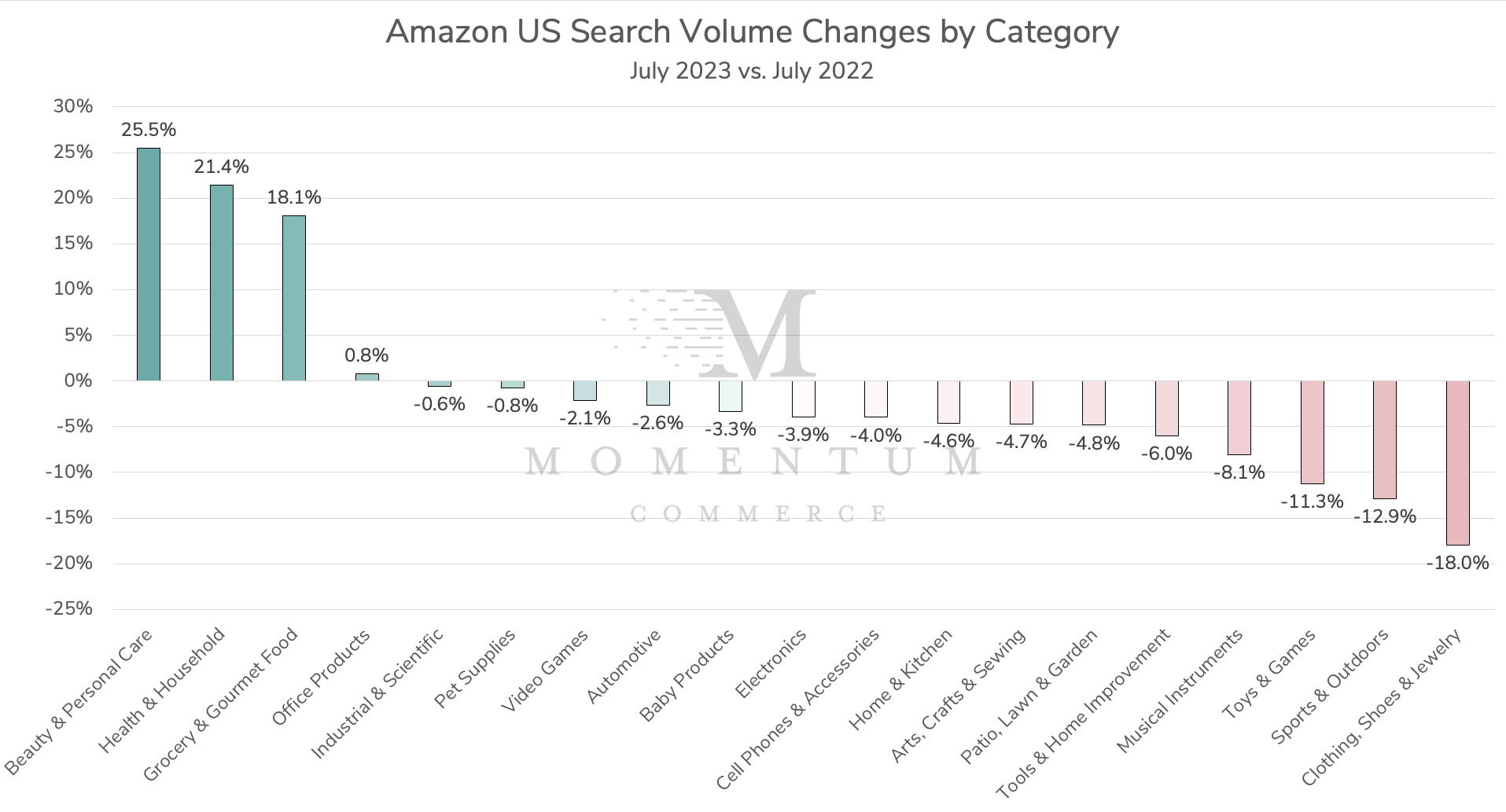 - This latest July analysis is the fourth-straight period analyzed by Momentum Commerce where Beauty & Personal Care posted the largest YoY search volume increase of any category on Amazon US
