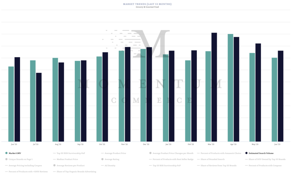 - As seen in the screenshot below from Momentum Commerce’s Velocity platform, Grocery & Gourmet Foods’ ascendance reflects a slow increase for the category both on a search volume and GMV perspective over the past year.