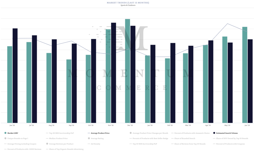 - Despite the search volume decreases, June 2023 GMV in the Sports & Outdoors category on Amazon reached levels near November 2022 – thanks in part to a higher average price