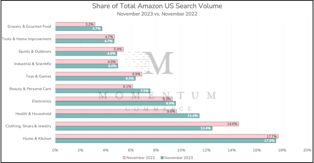 - 23% of Amazon search volume was driven by these 3 categories, up from 19% one year ago.