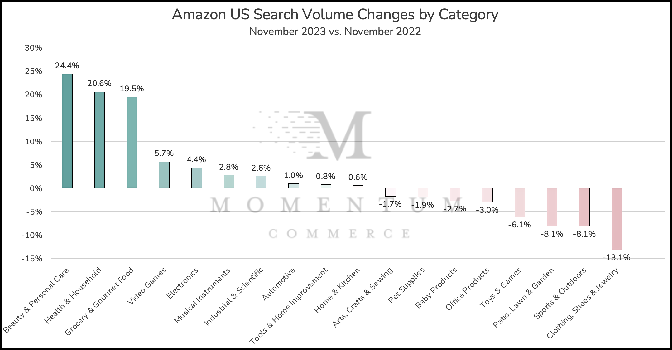 - Once again, the largest increases in share of total Amazon US search volume over the past year went to Beauty & Personal Care (+24.4%), Health & Household (+20.6%), and the Grocery & Gourmet Food (+19.5%) categories