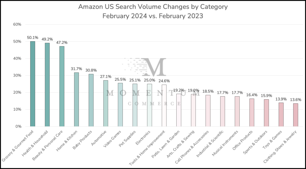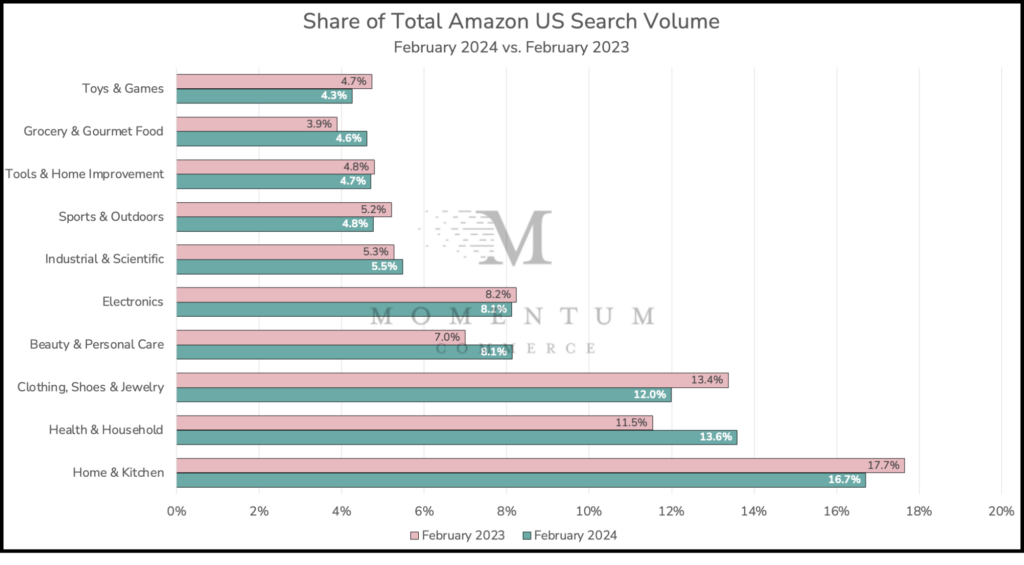 Data included in this analysis is based off of search volume estimates across the top 1,000,000 search terms on Amazon during February 2023 and February 2024. Search terms were categorized based on the top-level category associated with the majority of products appearing on the corresponding search results pages.