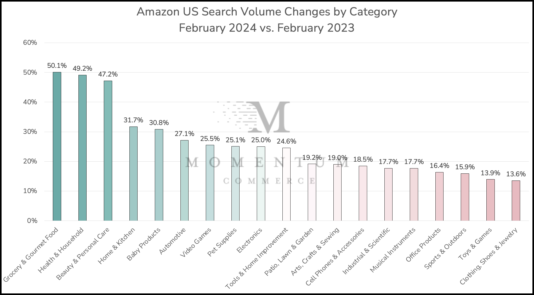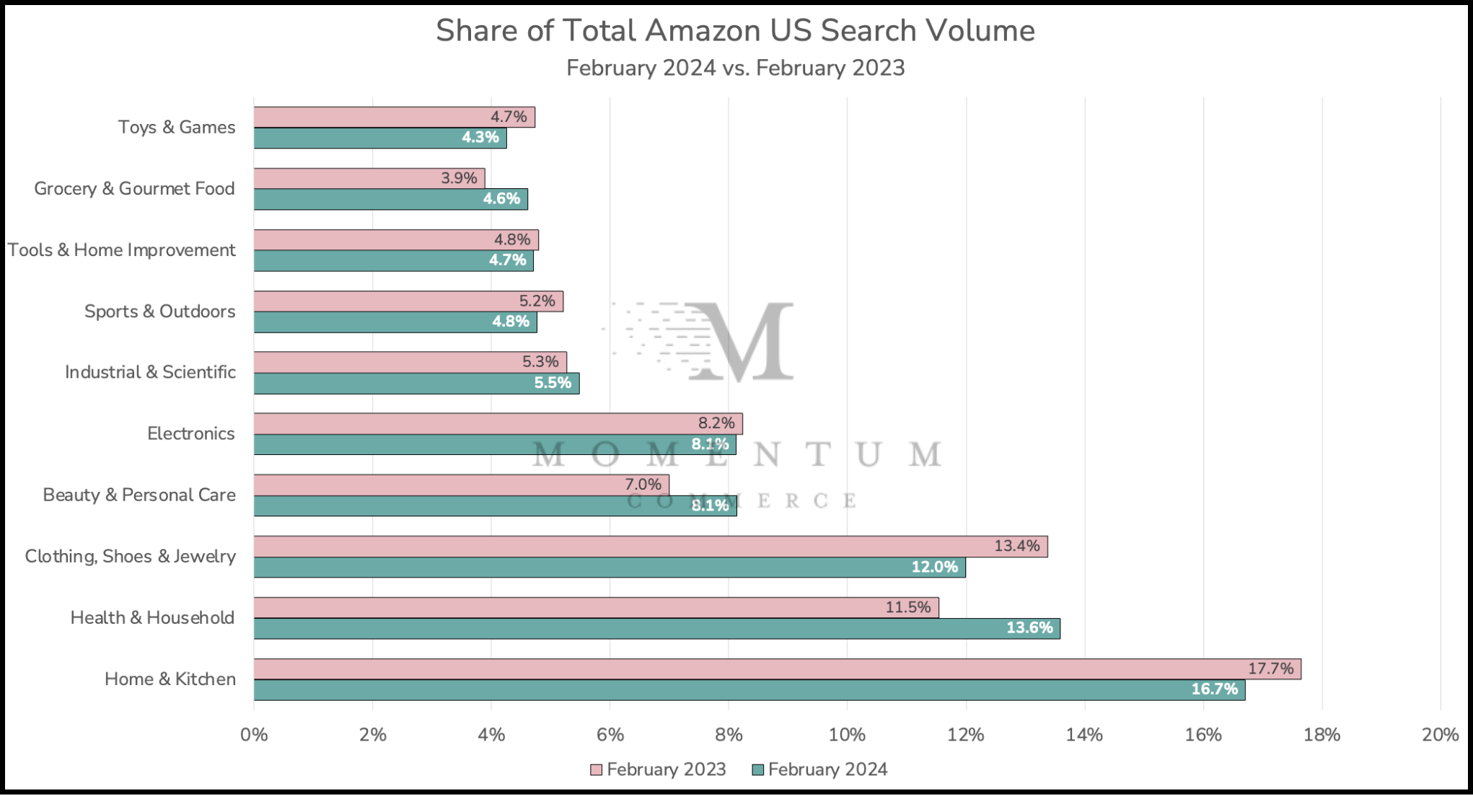 Amazon US search volume increased by more than 26% year-over-year in February 2024 – the sixth-straight analysis Momentum Commerce has cataloged a year-over-year (YoY) traffic increase, and the largest YoY increase measured to date. This is the third analysis where every category studied posted a YoY traffic increase. Despite the significant annual growth, search traffic on Amazon US dropped by 2% month-over-month from January 2024.