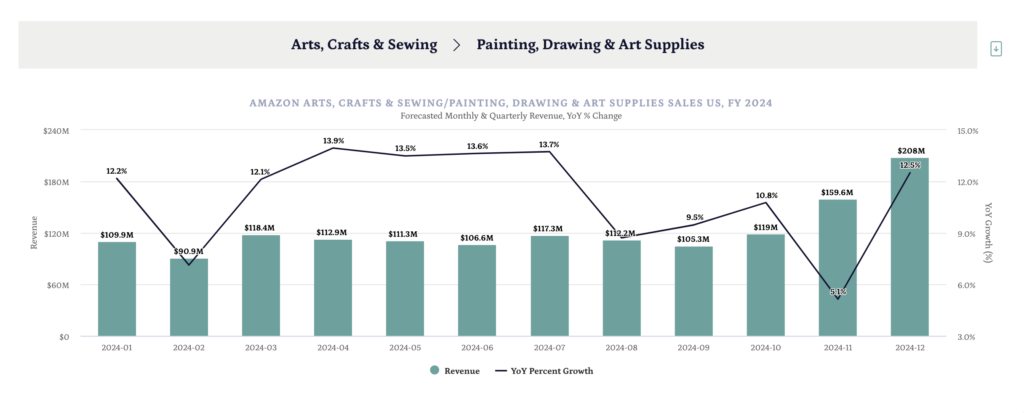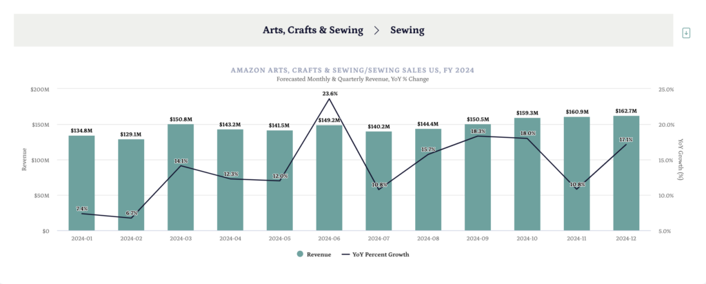 What is the forecasted growth for the Arts, Crafts & Sewing category on Amazon US through 2024? How should brands in this category prepare their growth strategies? Over the next few months, we will be estimating specific categories’ 2024 revenue using our latest free tool, the Amazon Sales Forecast Dashboard.