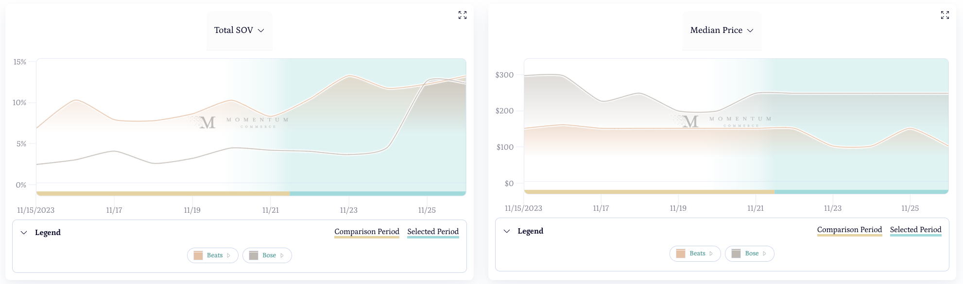 Beats was clearly the most aggressive brand in this popular gift-giving category. While Bose drove larger total and paid SOV changes than Beats, they largely did not pair their increased visibility with discounts.