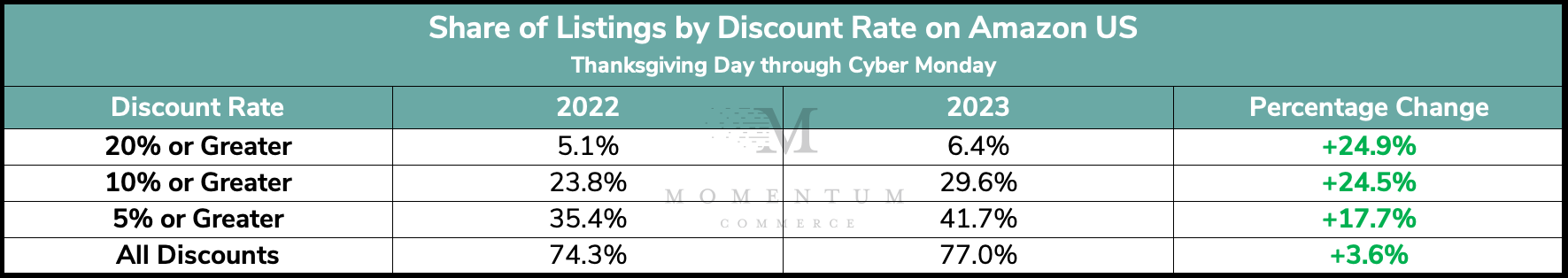 From Thanksgiving through Cyber Monday 2023, discounting activity across Amazon US was both more pervasive and slightly steeper than 2022 averages. This increase in discounting extended to actual price discounts, more ‘deal’ badges on products across the site, and cut across categories.