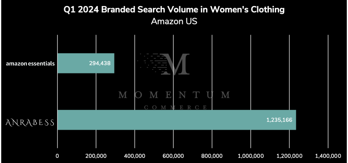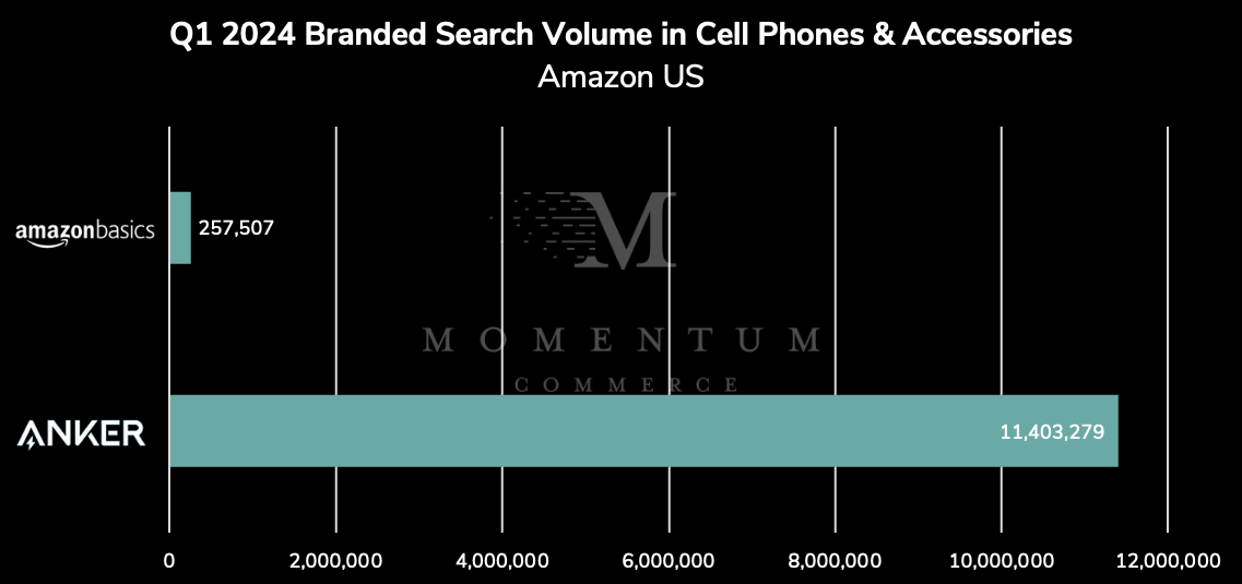 Momentum Commerce utilized third-party revenue estimates to determine the highest-grossing brands on Amazon US over the course of Q1 2024. The top 10 Chinese-owned brands were segmented out for the purposes of this analysis. Monthly estimated search volumes were then calculated across all searches that included those brands’ names within the search query itself across the comparison periods of Q1 2024 and Q1 2023.