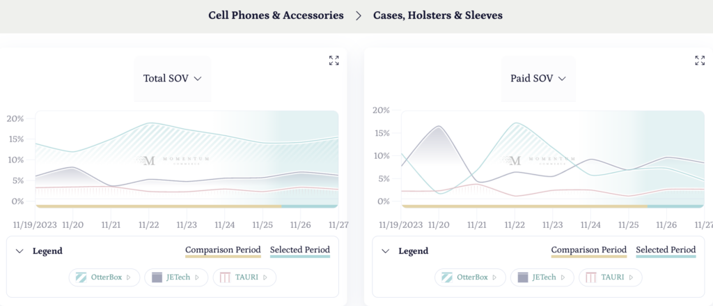 OtterBox entered Cyber Week already on top in terms of Total SOV, and a strong brand presence allowed for the brand to remain on top. OtterBox’s Organic SOV change for the given period was 2.04%, the most out of any brand in the category.