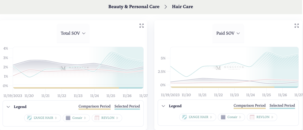 - L’ANGE HAIR increased their Paid SOV by 1.86% during the Cyber Monday period (the largest increase in the category for this time frame)