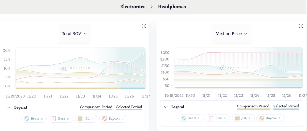 While big names Bose, Apple, and Beats seemed to take an aggressive approach early on in Cyber Week, these brands began to taper off their Paid Ad spend and reduce discounts, allowing smaller brands like Raycon to creep in.