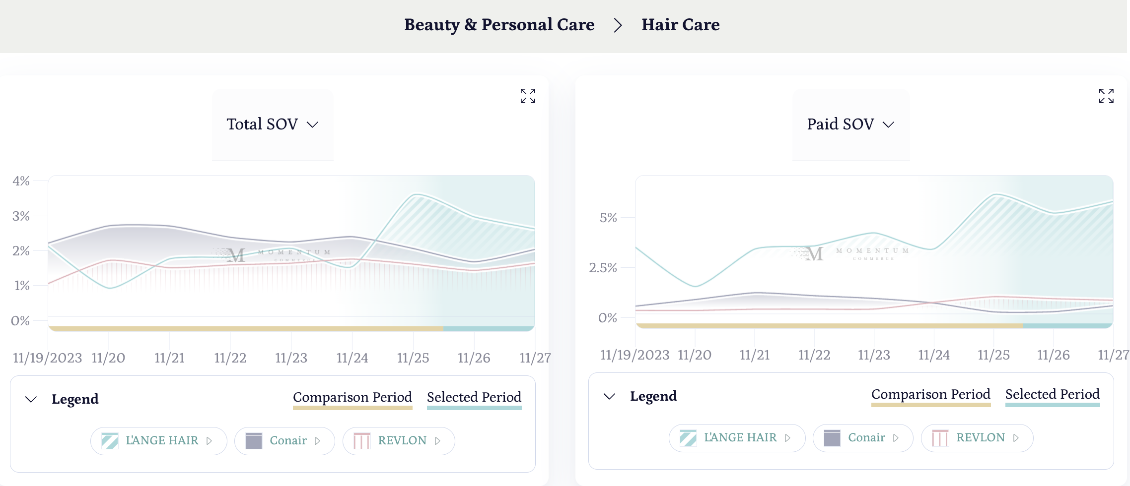 - L’ANGE HAIR increased their Paid SOV by 1.86% during the Cyber Monday period (the largest increase in the category for this time frame)