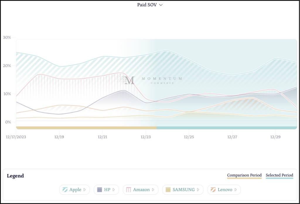 - Apple maintained a dominant position within the subcategory, securing the top spot on our Leaderboard with 20.92% Total SOV for the selected period. When looking beyond Apple, the rest of the category battled it out through the end of the season, fighting back and forth for paid placements. Apple and Amazon did begin to pull back on paid ad spend towards the end of this analysis.