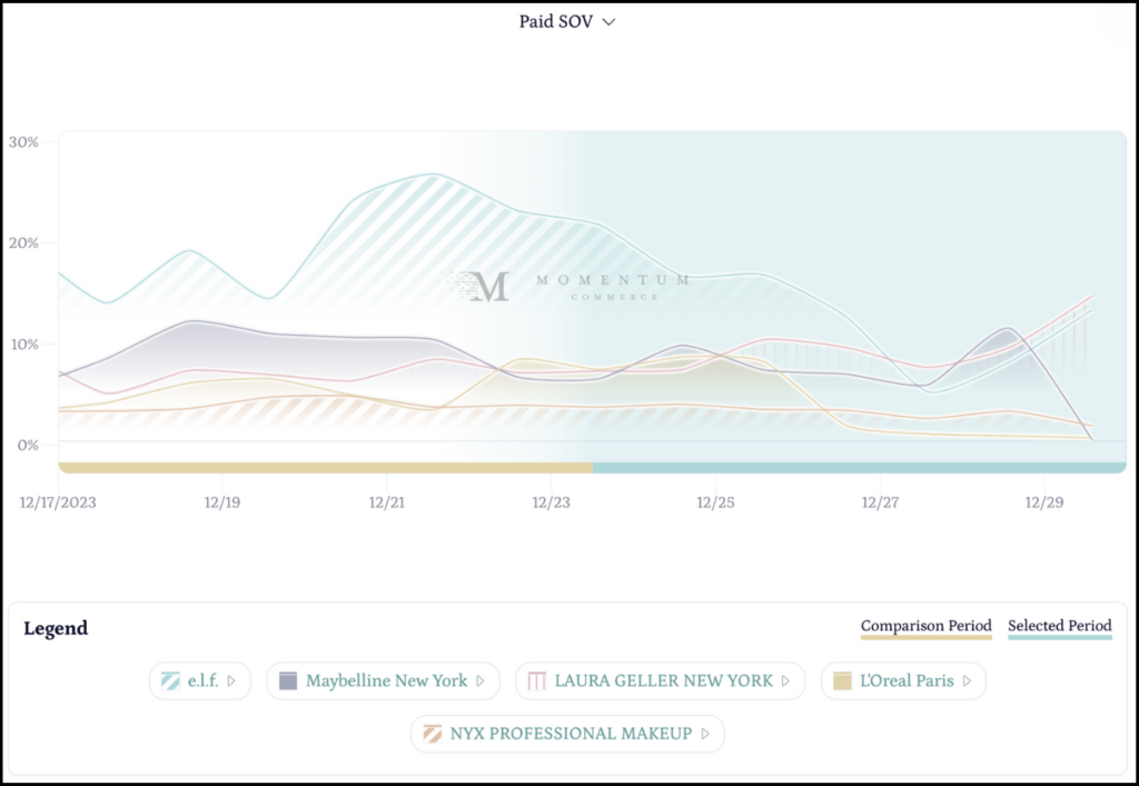 - The dynamics within the Face Makeup subcategory are intriguing, as reflected in the Leaderboard. Although e.l.f. initially dominated Paid SOV in the days leading up to Christmas, their share shrunk by 6.79% versus the previous period, allowing for Maybelline New York and Laura Geller New York to make gains.