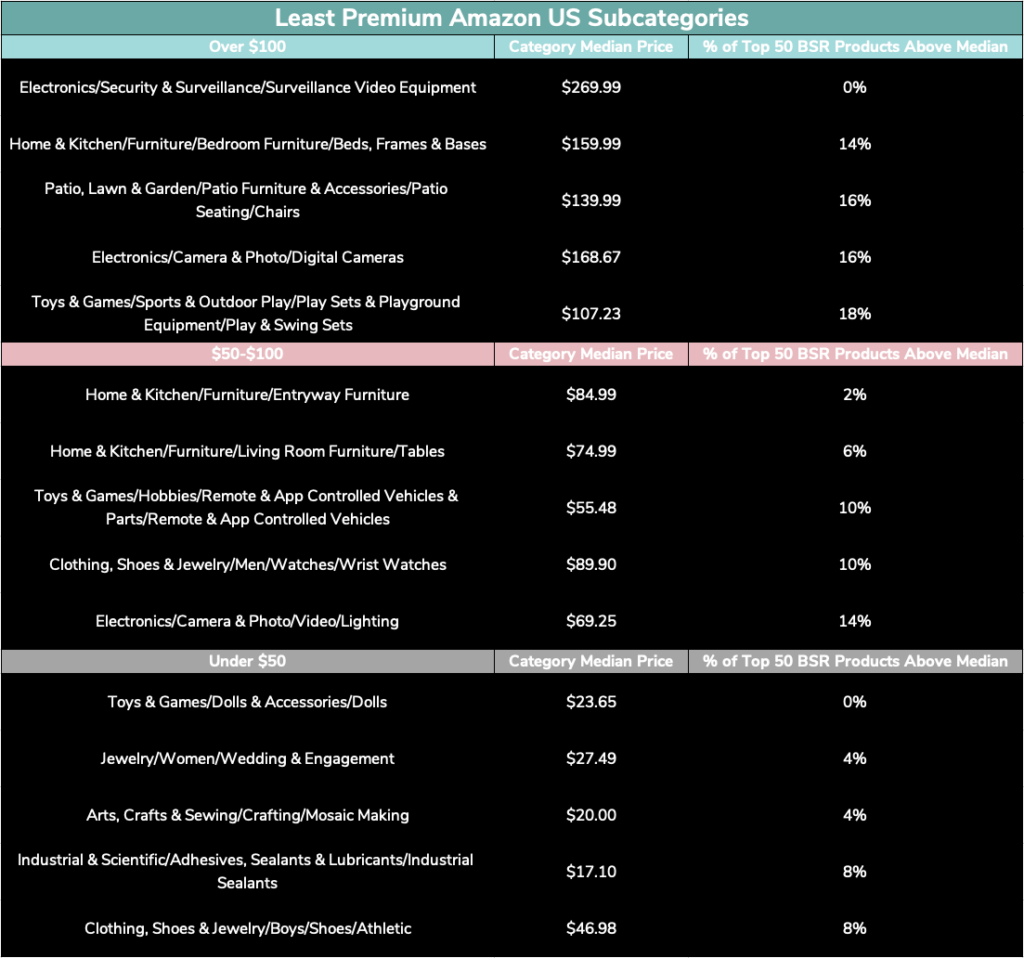 Amazon’s sprawling marketplace naturally has developed pockets where consumers are more prone to spend top dollar, alongside budget-minded categories. After looking across the top 1,500 level 3 and 4 subcategories by monthly search volume, roughly 15% had a majority of top 50 BSR products priced above the median price for that category – a rate that stays largely consistent even after splitting up categories by median price.