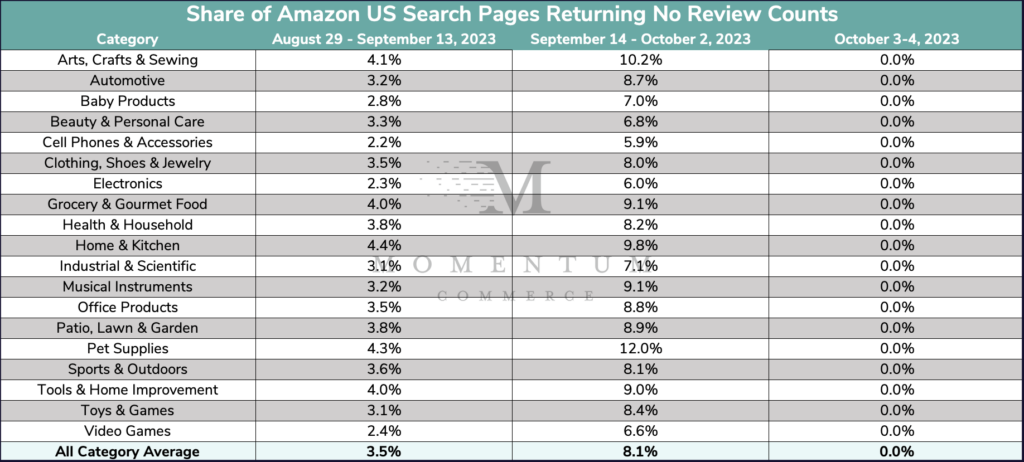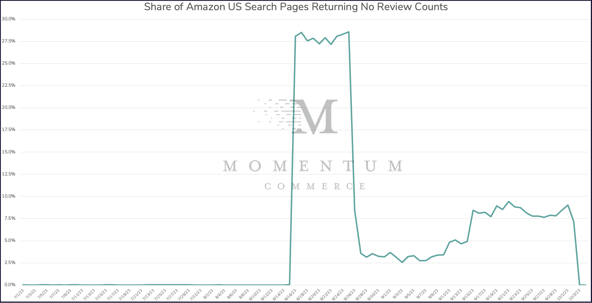 After a roller coaster ride in August, with the prevalence of Amazon US search results showing no review counts skyrocketing, then significantly dropping just 10 days later, September offered another round of volatility. Beginning on October 3, review-less searches became virtually absent across all of Amazon US.