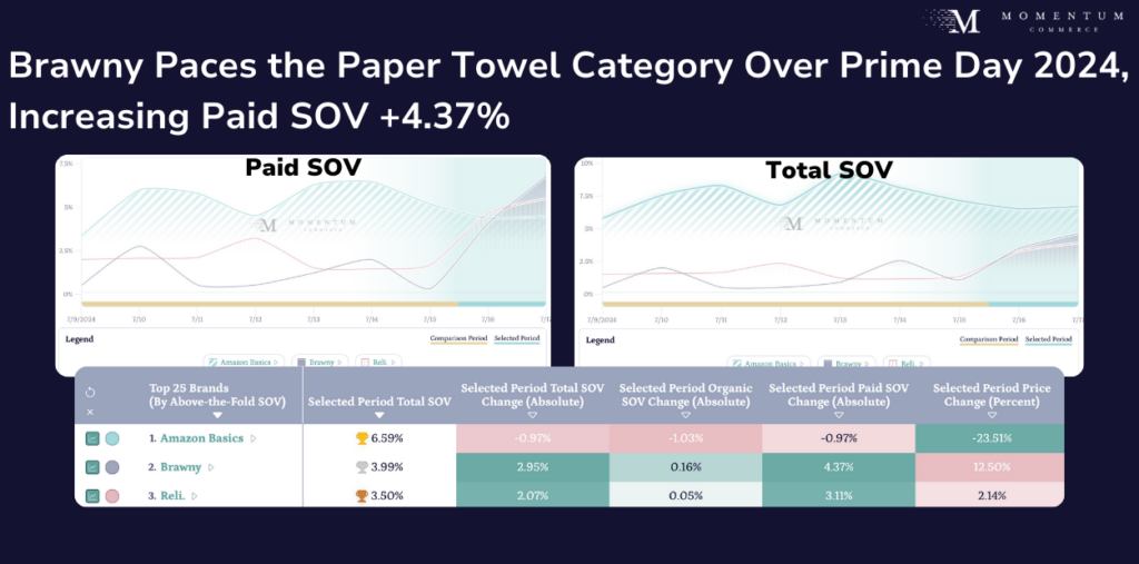 - Notably, 60% of purchases occur on the first day of Prime Day. Brawny’s strategy to boost visibility on this crucial first day contrasted with Amazon Basics, which focused on seeding demand prior to the event.