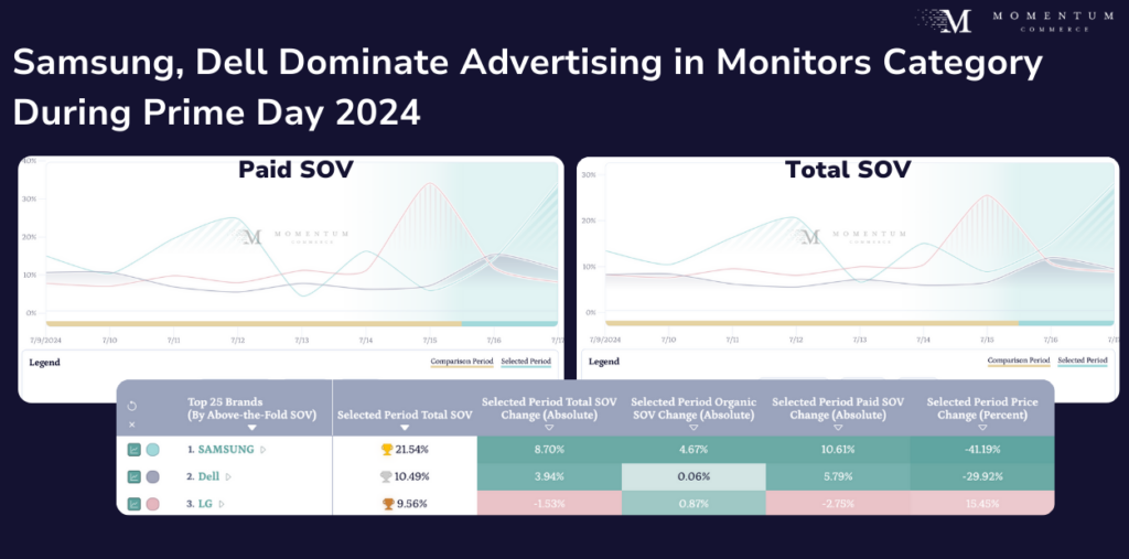 - In the Computer Monitors subcategory, Samsung increased paid placements by +10.61% during Prime Day, the largest of any brand