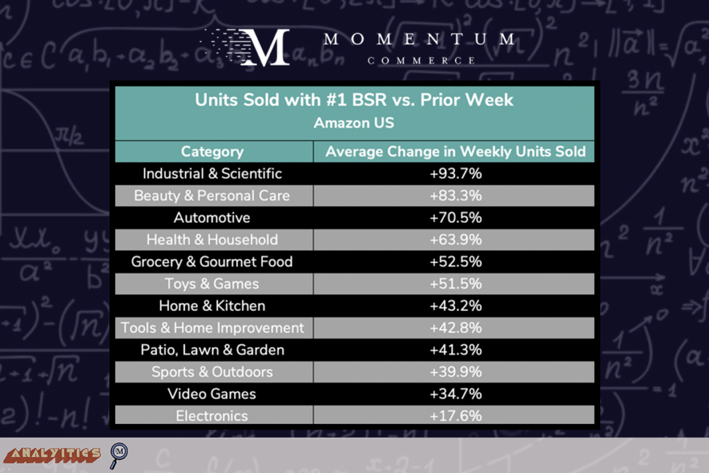 • The categories boasting the largest week-over-week sales increases for #1 BSR products tend to be much more fragmented from a market share perspective, and slightly less branded in terms of search behavior