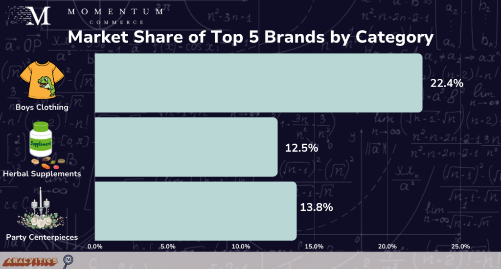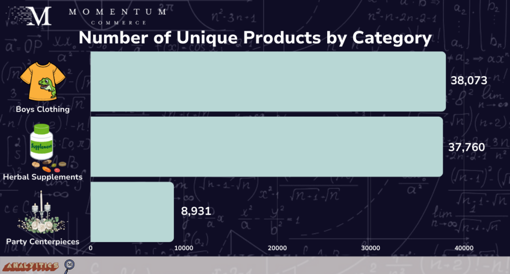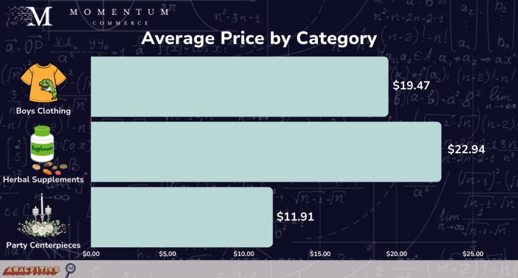 Momentum Commerce examined the lowest Amazon Best Seller Rank (BSR) across the top 5 organic results in search terms associated with all depth 1, 2, and 3 categories between May 6 and May 12, 2024 on Amazon US (e.g. Beauty & Personal Care > Skin Care > Face). For each category, the top 10 search terms by volume were studied and were enriched with the number of overall unique products and average price. For comparisons, terms where no product with a BSR better than 5 appeared across the top 10 organic results were compared with overall Amazon site averages with the same criteria (e.g. all Clothing Shoes and Jewelry > Women’s > Dresses related terms).