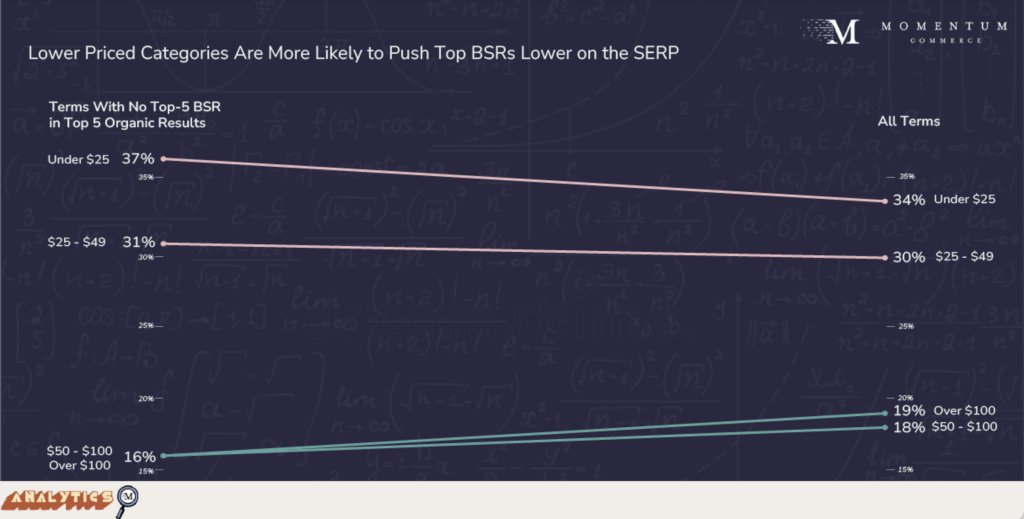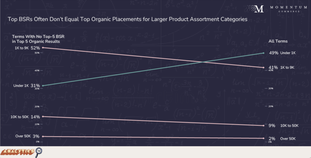 Popular search terms associated with categories sporting larger product assortments and lower average price were more likely to not put top BSR products at the top of organic results.